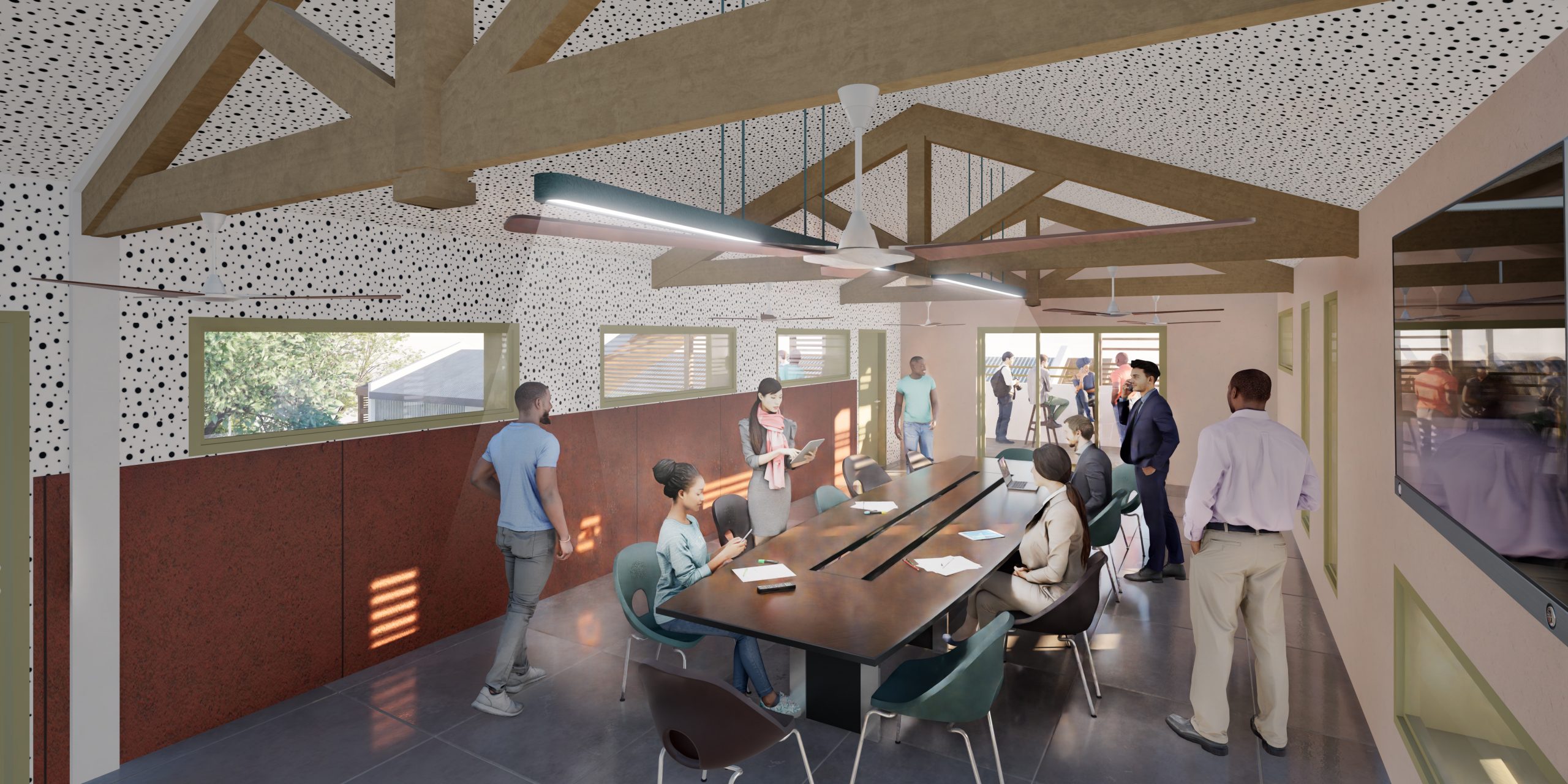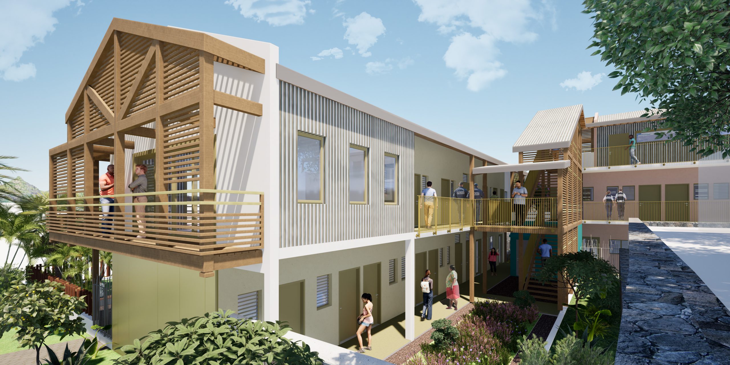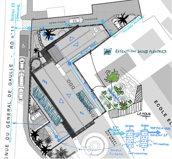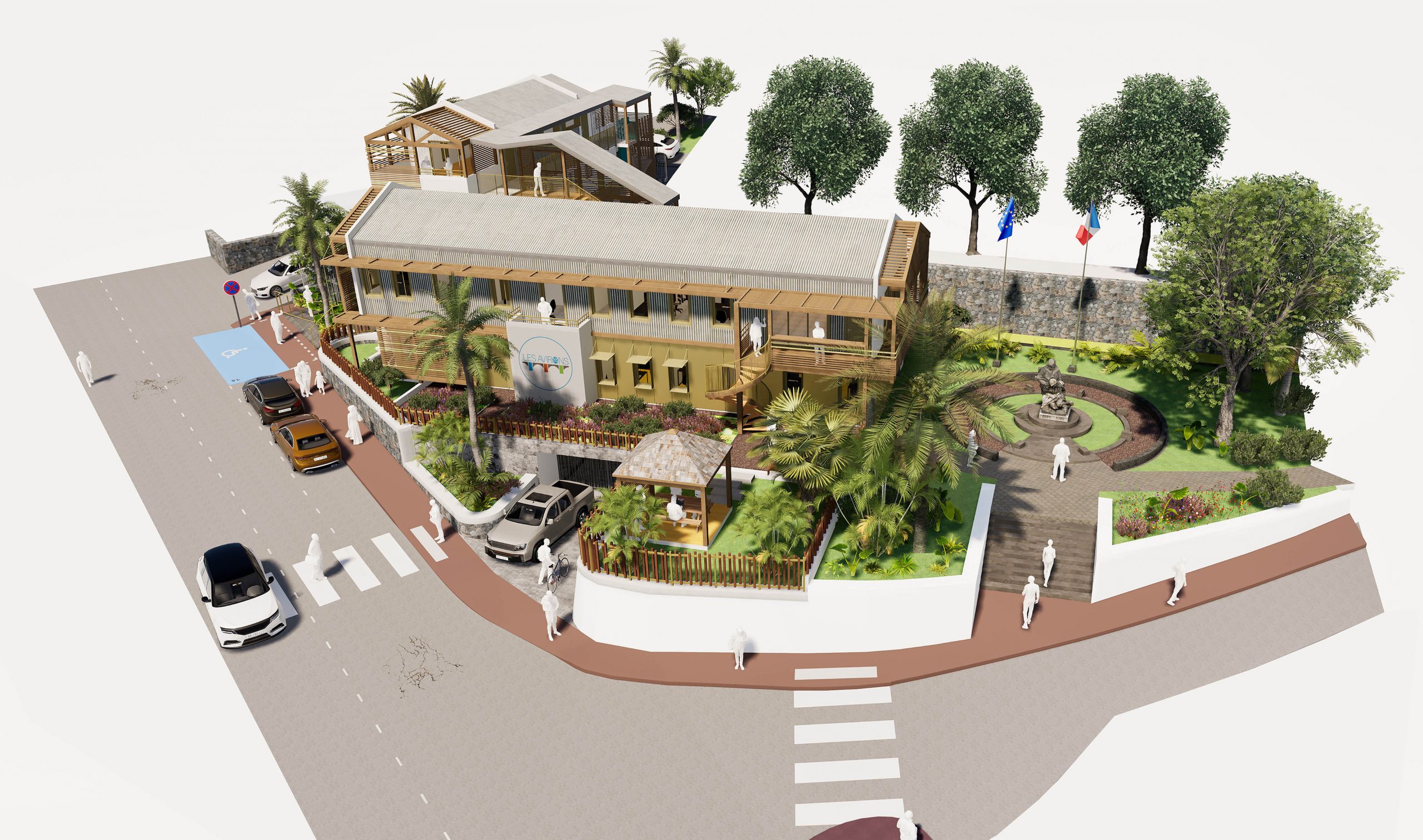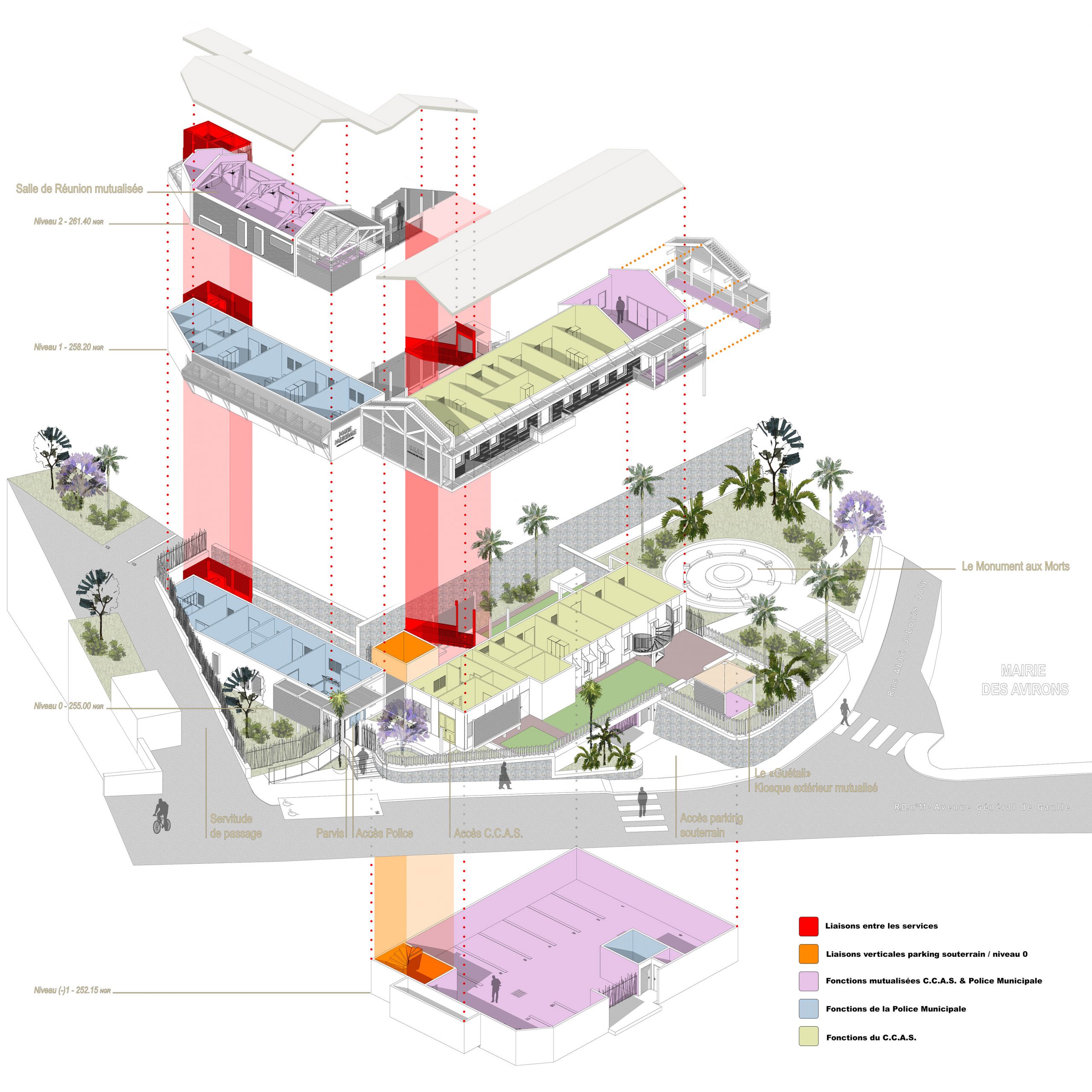 Les futurs locaux du CCAS et de la Police municipale des Avirons, de part leur positionnement au coeur du centre ville, seront accessibles, visibles. On pourra les appréhender depuis l’Avenue du Général de Gaulle et les espaces publics adjacents (Mairie, Place du Monument aux Morts, commerces et services en vis-à-vis). L’adhésion des habitants au projet passe par une image soignée, une architecture à la fois contemporaine et rassurante. Le bâtiment est conçu comme deux longères se rejoignant sur un parvis, lui donnant une identité propre remarquable. En adéquation avec sa fonction de service au citoyen, il constitue un repère urbain facilement identifiable. Les volumes sont habillés de double peau et de claustras d’ombrage protégeant les locaux, et des terrasses ponctuelles permettent aux utilisateurs de bénéficier d’espaces extérieurs ayant vue sur l’environnement immédiat et lointain.